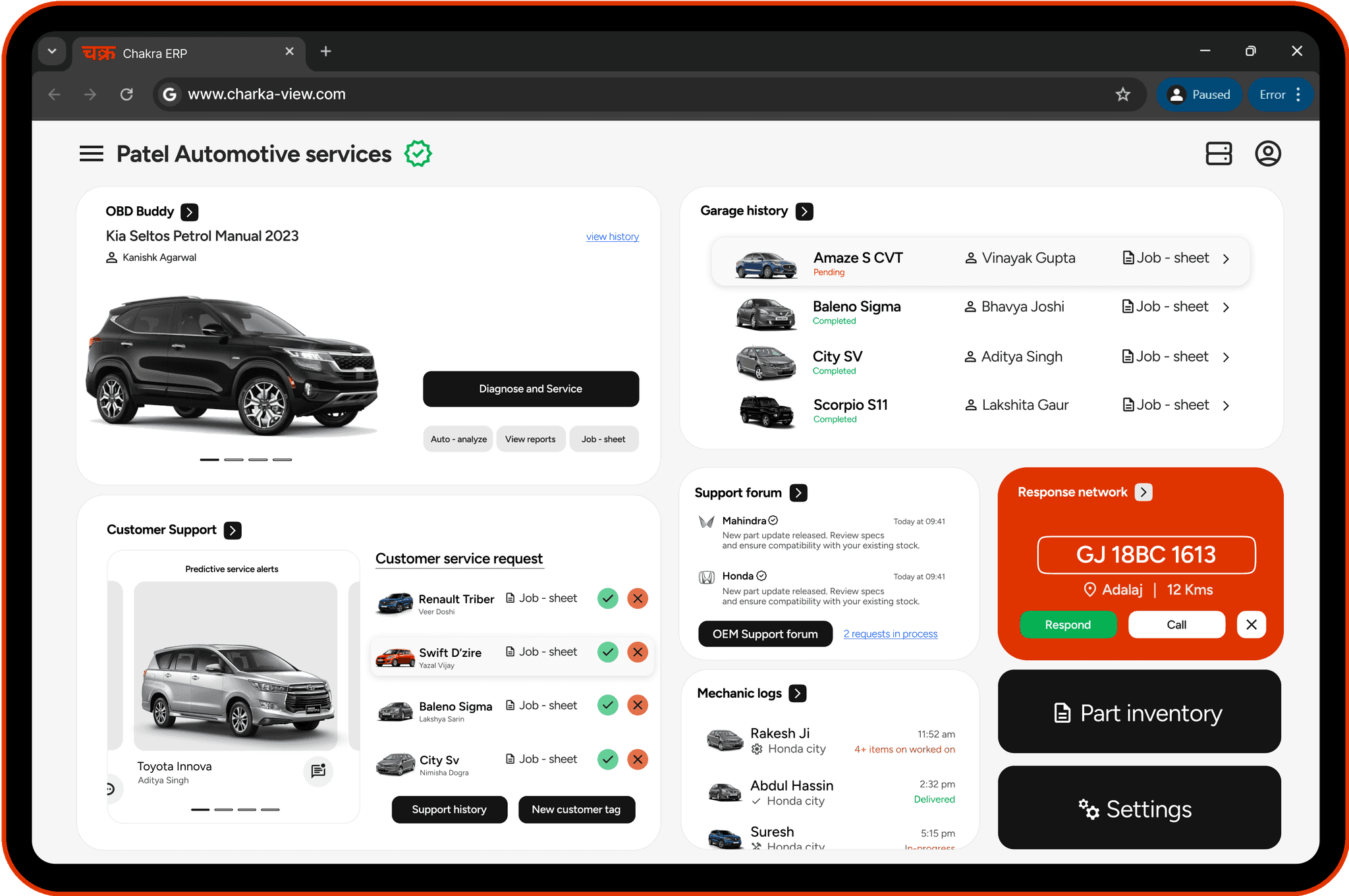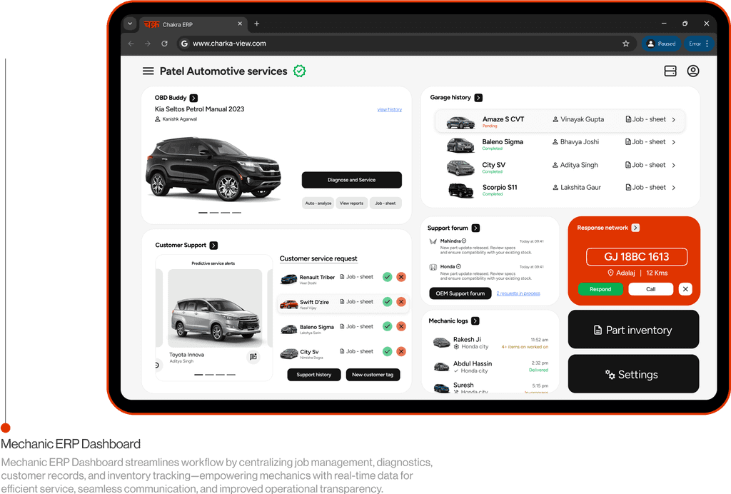 Chakra is a seamless ecosystem connecting garages and vehicle owners, streamlining repairs, service tracking, and communication through smart technology—enhancing efficiency, transparency, and customer satisfaction at every step.